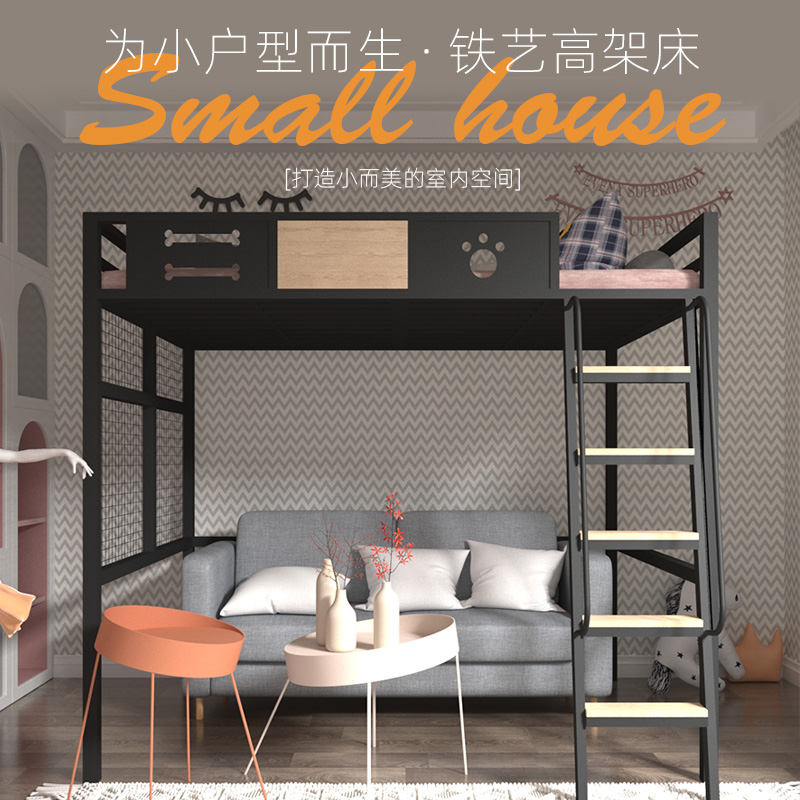 Elevated Bed Provincial Space Loft Beds Bed Lower Table Apartment bed modern minimalist Double single-floor iron art bed-Taobao