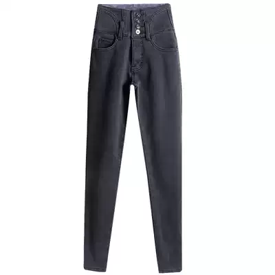 High-waisted smoky gray and velvet jeans Women 2020 winter wear elastic slim and thickened one-piece cashpipe pants