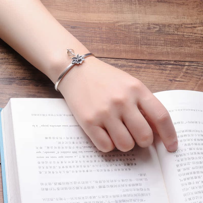 s925 Pure Silver Lotus Bracelet Female Style Original Opening Retro National Wind Art Temperament Brief Silver Bracelet