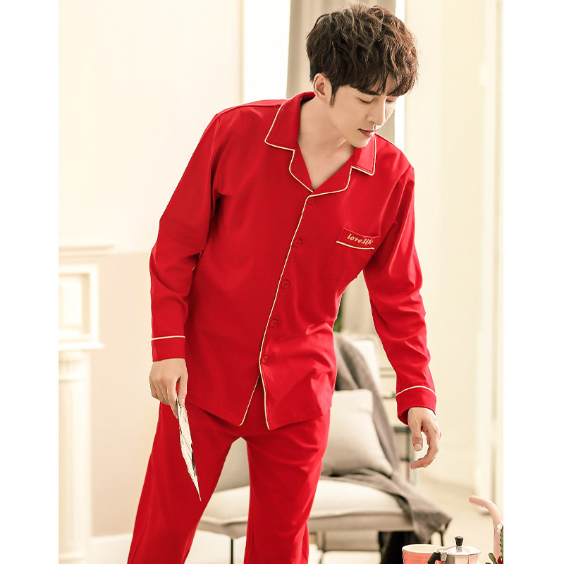 Red Pyjamas Men's Life Pure Cotton Long Sleeves Long Pants Spring Autumn Suit New Big Red Plus Mast Size Men's Style Home Clothes