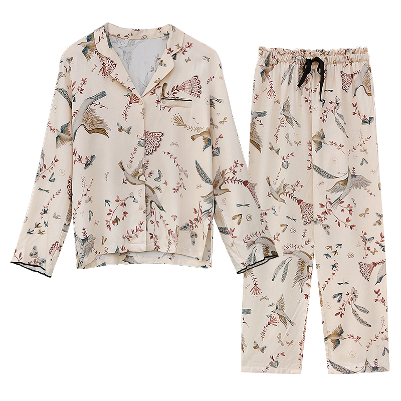 Floral bird printed retro cardiovert long sleeve long version pyjamas women's spring and autumn suit cotton silk winter net red and thin family clothes