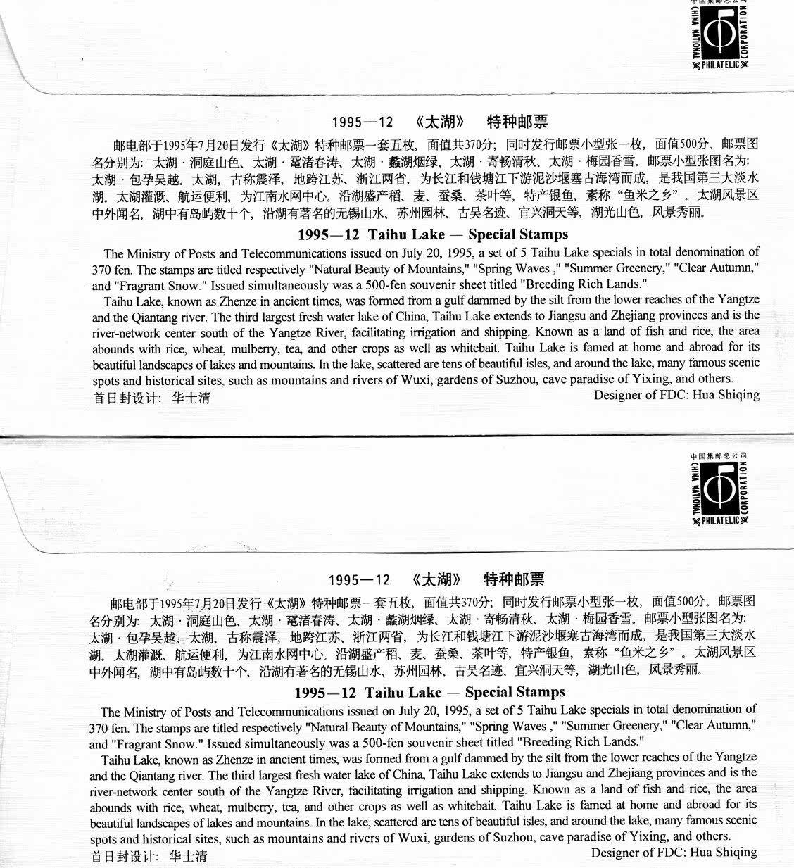 1995-12 "Taihu" special stamp commemorative cover set of 2