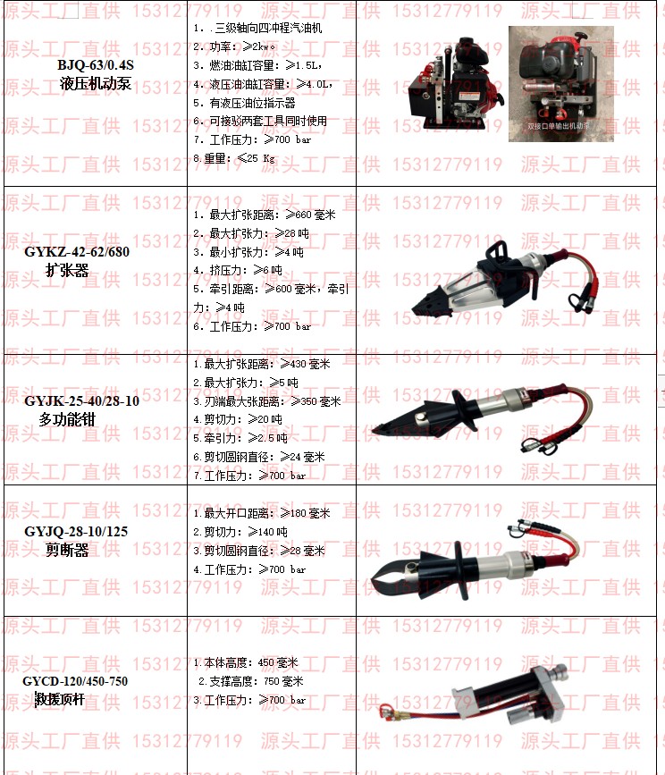 Single output motorized pump (one tow one) double output motorized pump (one tow two) Hydraulic multi-function pliers (shearing forceps) Hydraulic shears (shears) Hydraulic expanders Hydraulic ejector rods (top braces) Hydraulic hand pumps (one drag one)