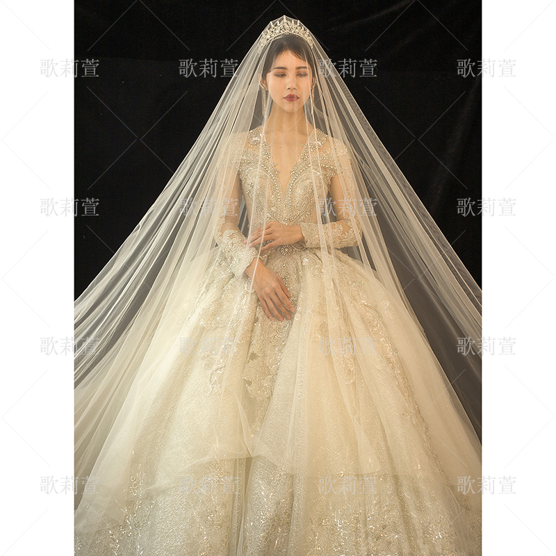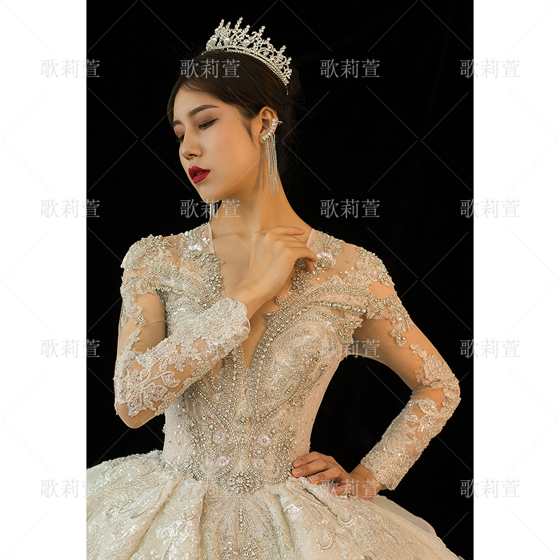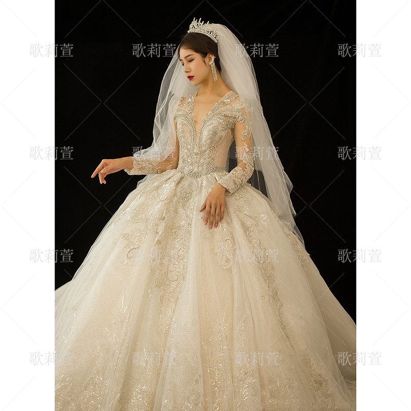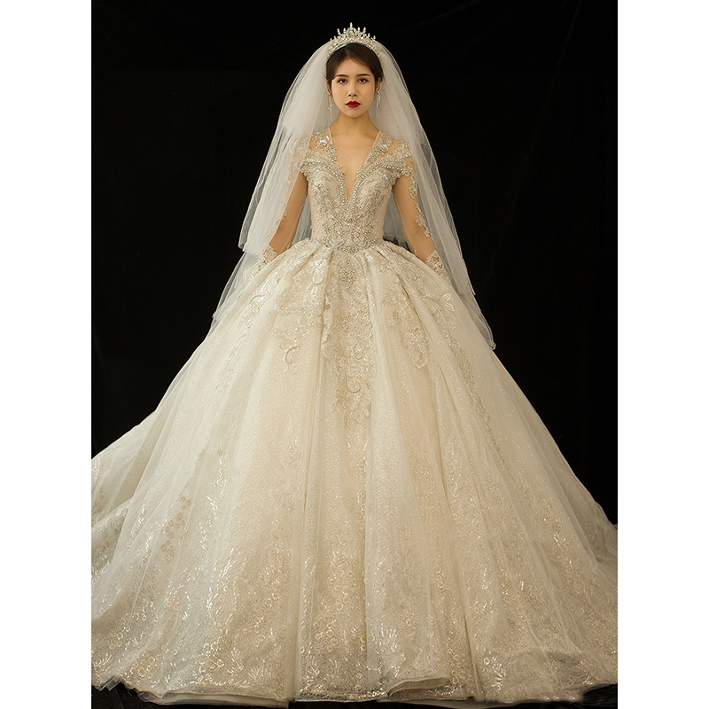 Long-sleeved wedding dress 2021 new temperament bride 2020 French V-neck heavy industry luxury court style big tail