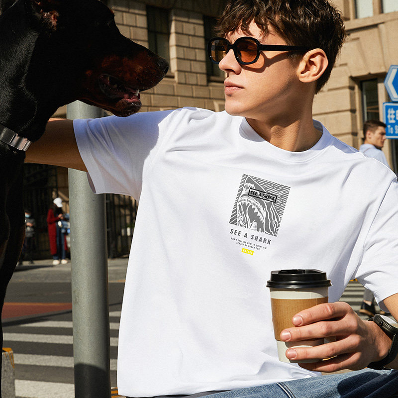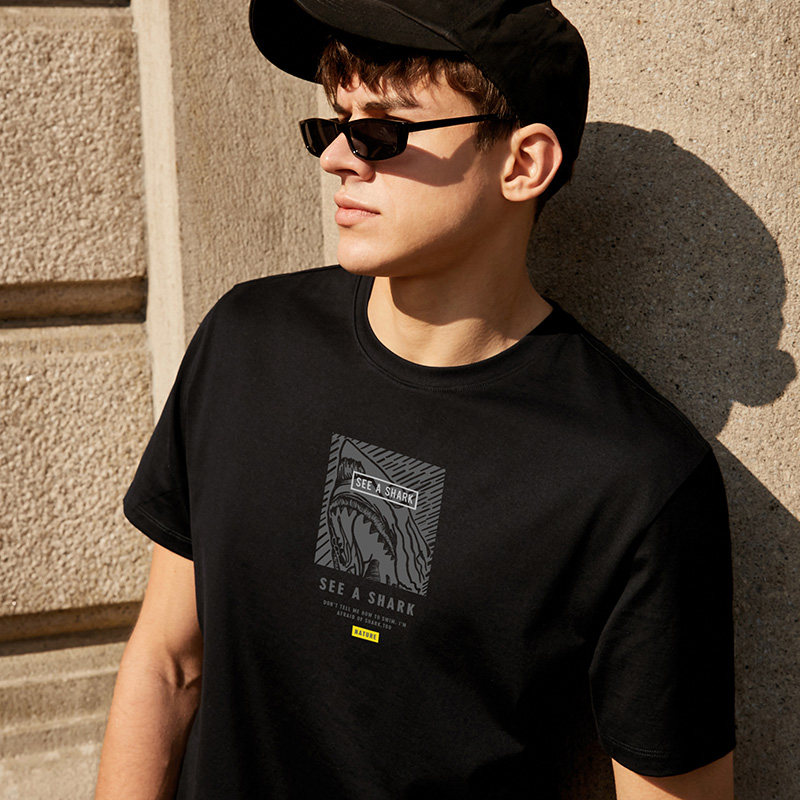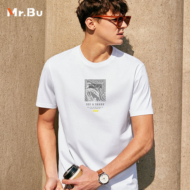 MrBub Mr. micro-profile shark printed pure cotton T-shirt male short sleeve fashion black printed T-shirt GT01139 -Taobao