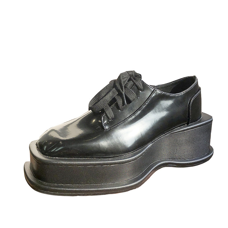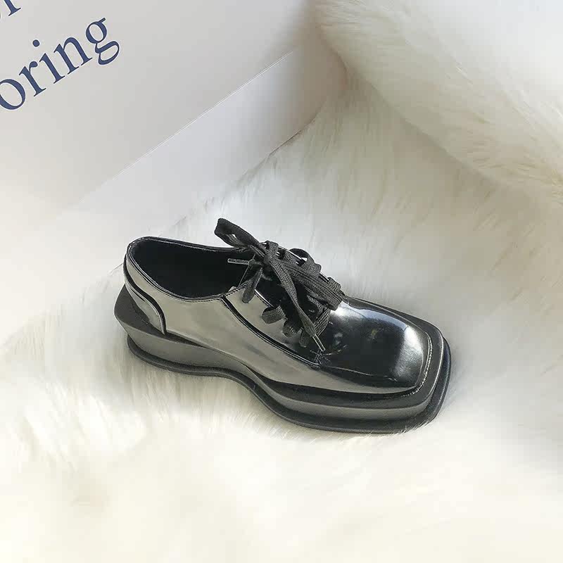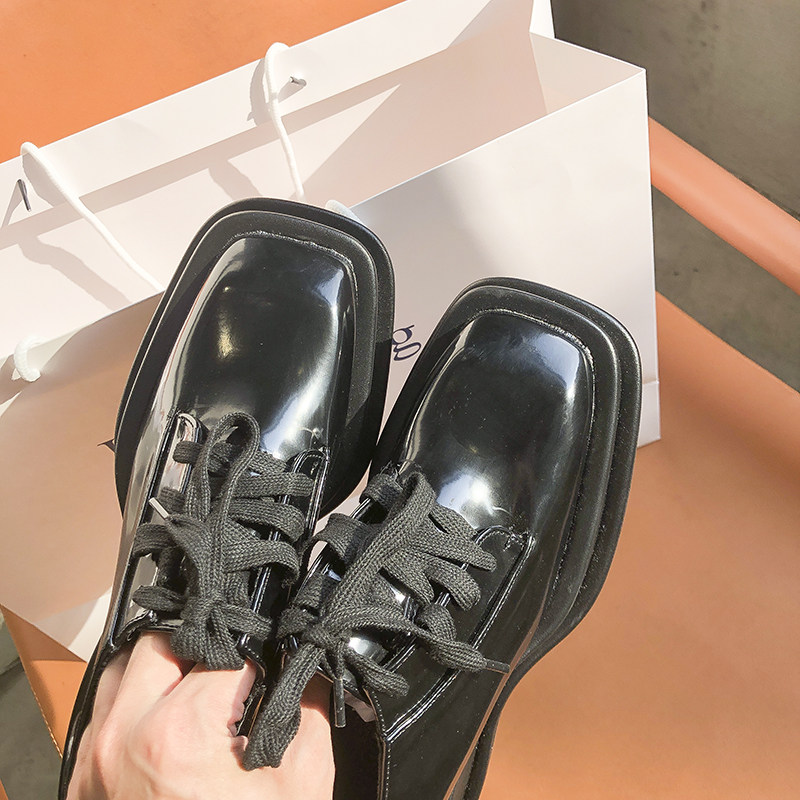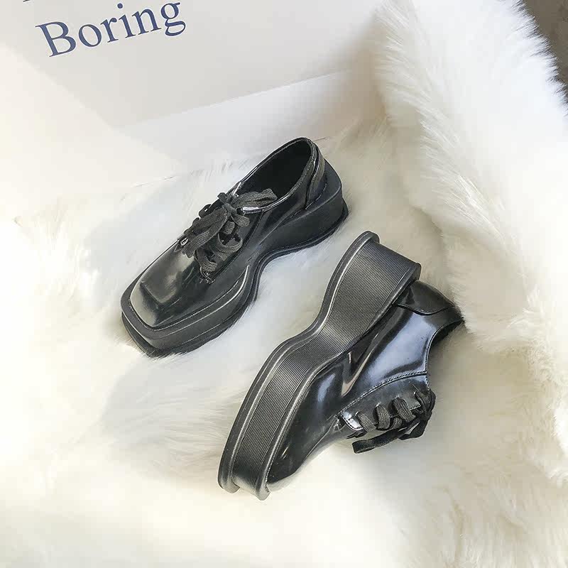 Small leather shoes women's 2021 new British style thick-soled lace-up all-match loafers heightened deep mouth black patent leather shoes