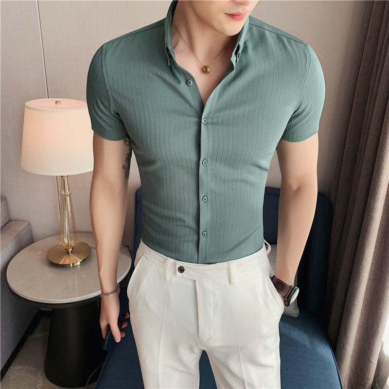Spring and summer new striped short-sleeved shirt men's Korean version of the trend slim long-sleeved shirt British casual wild inch clothes