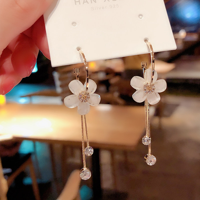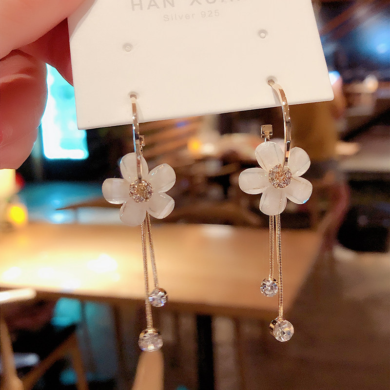 South Korea Dongdaemun Earrings Women's Tide Temperament Crystal Five-petal Flower Long Edition Tassel Earrings 925 Sterling Silver Needle Earrings