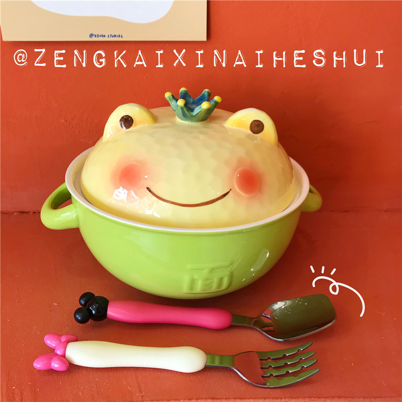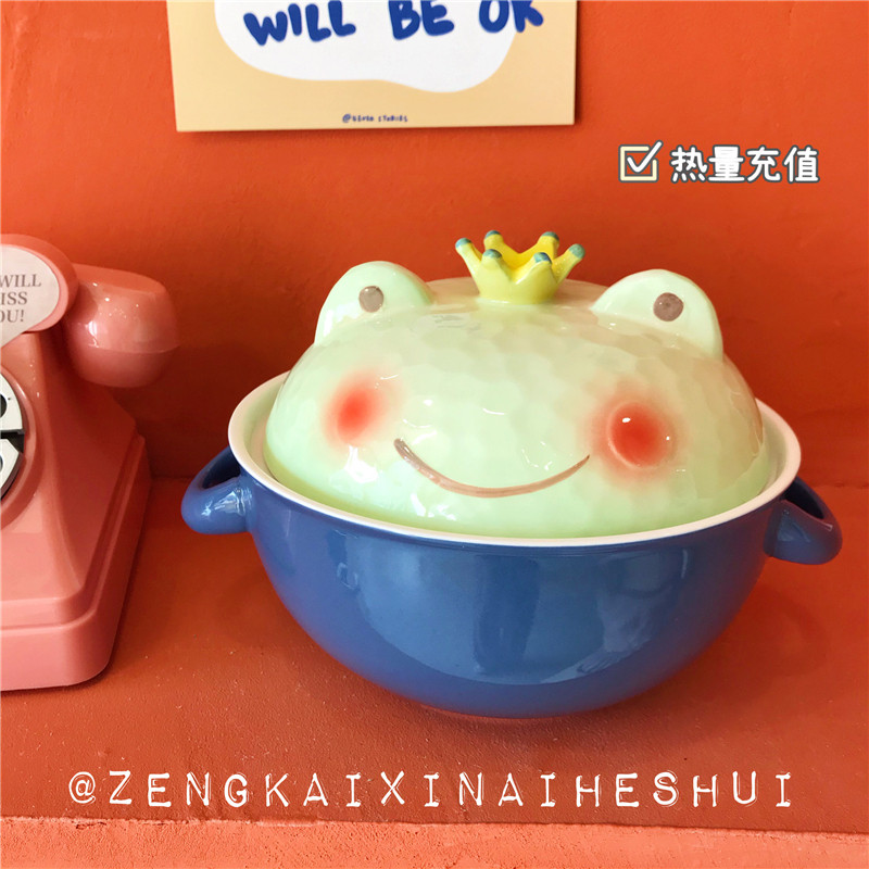 Han Style Cute Cartoon Frog Teenage Hearts students Ceramics Convenient Bubble Noodles Bowl with lid Japanese Dormitory Creativity