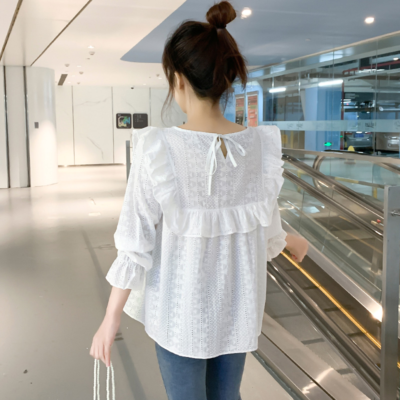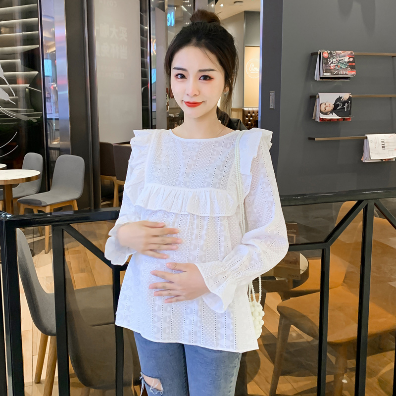 Pregnant women spring coat new autumn hollow embroidered lotus leaf shirt round bubble sleeve shirt spring and autumn