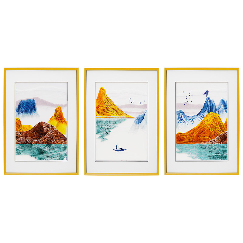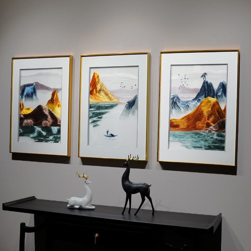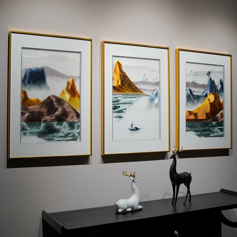 New Chinese-style freehand landscape triple pure hand-embroidered painting golden mountain living room sofa background wall finished hanging painting