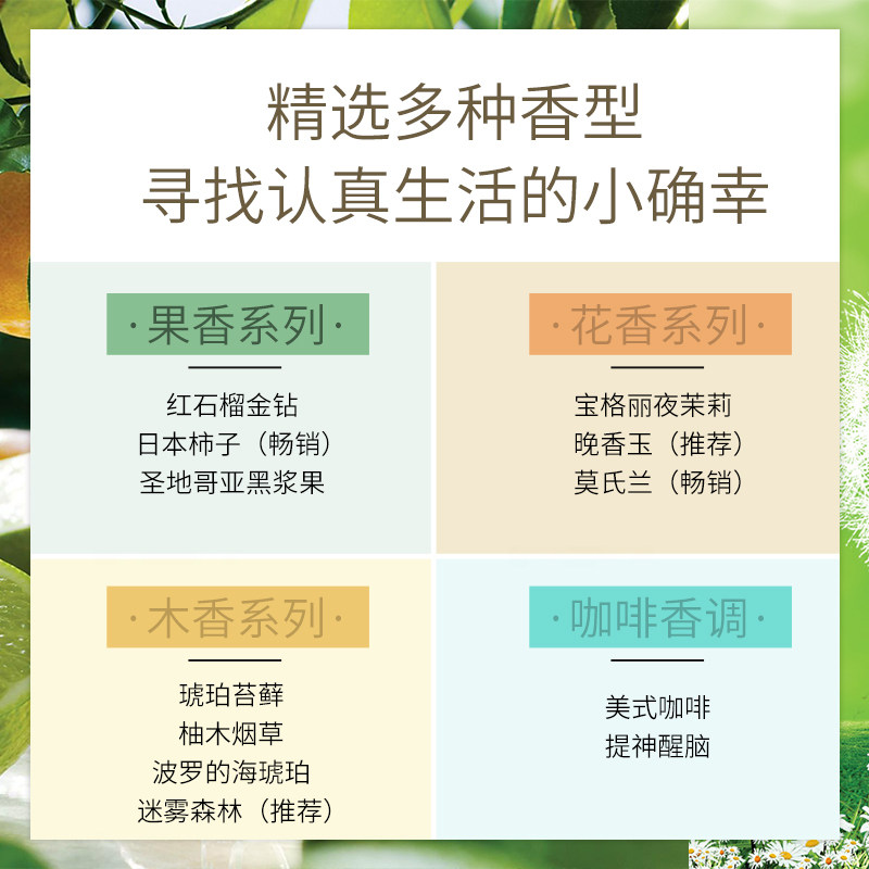 Cologne Sandalwood Osmanthus Sea Breeze Gardenia Wild Rose Blue Wind Chime Red Teak Orchid Camellia Black Amber Fig Westin White Peach Oolong Summer Fruit Denim Lace Japanese Plum Tobacco Patchouli Baltic Amber White Jasmine and Mint Sea Salt and Sage Lemon Lavender French Juniper Lavender Lime Basil and Citrus English Pear & Freesia