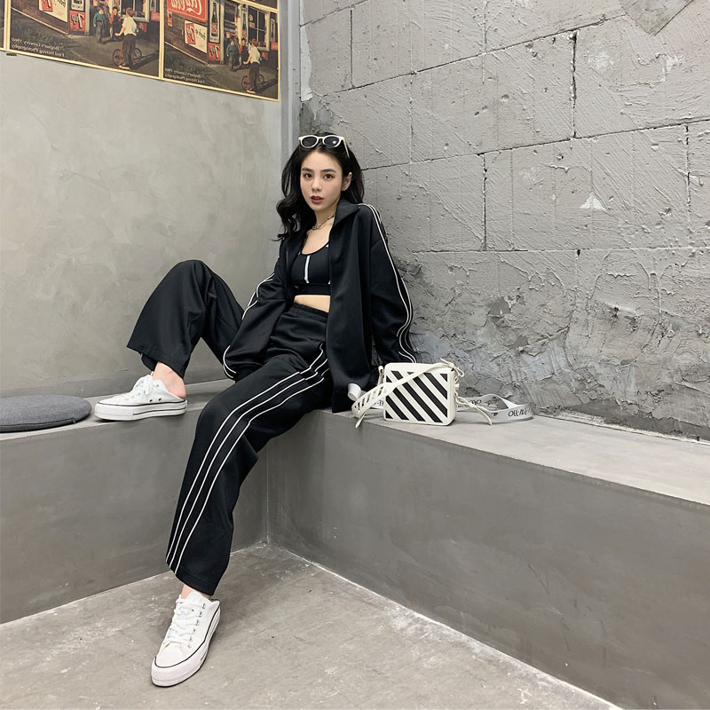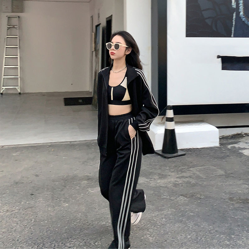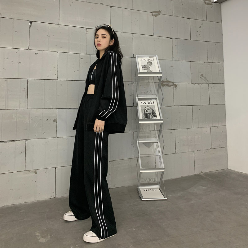 Broadlegged Pants Suit Women's Foreign Pie Age Fashion Small Subshow High Fry Street Sports Wind Black Casual Two Style Clothes