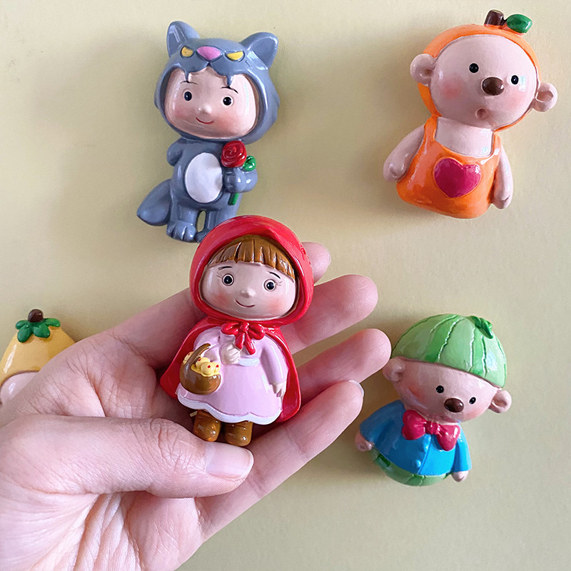 Cartoon Fridge Stick Cute Fruit Doll Solid Resin Fridge decorated with small red hat and large grey wolf magnet