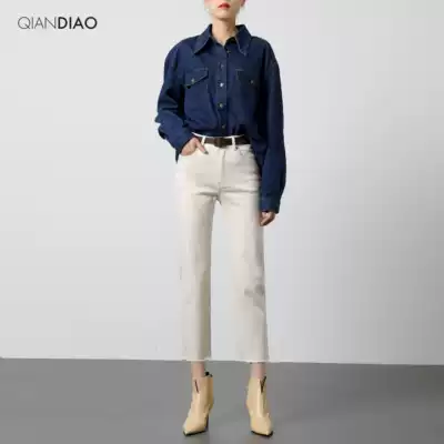 2021 spring beige stretch straight jeans women nine points high skinny high waist stretch pants