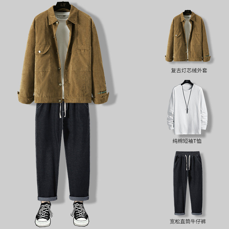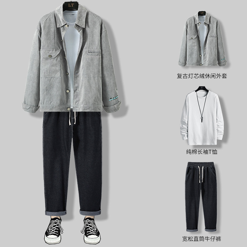 Grey Three sets (jacket 100 lap jeans pure cotton long sleeves) Coffee colour Three sets (jacket 100 lap jeans pure cotton long sleeves) Carits colour Three sets (jacket 100 lap jeans pure