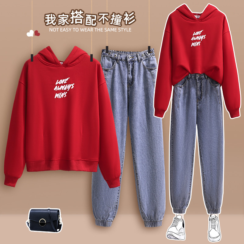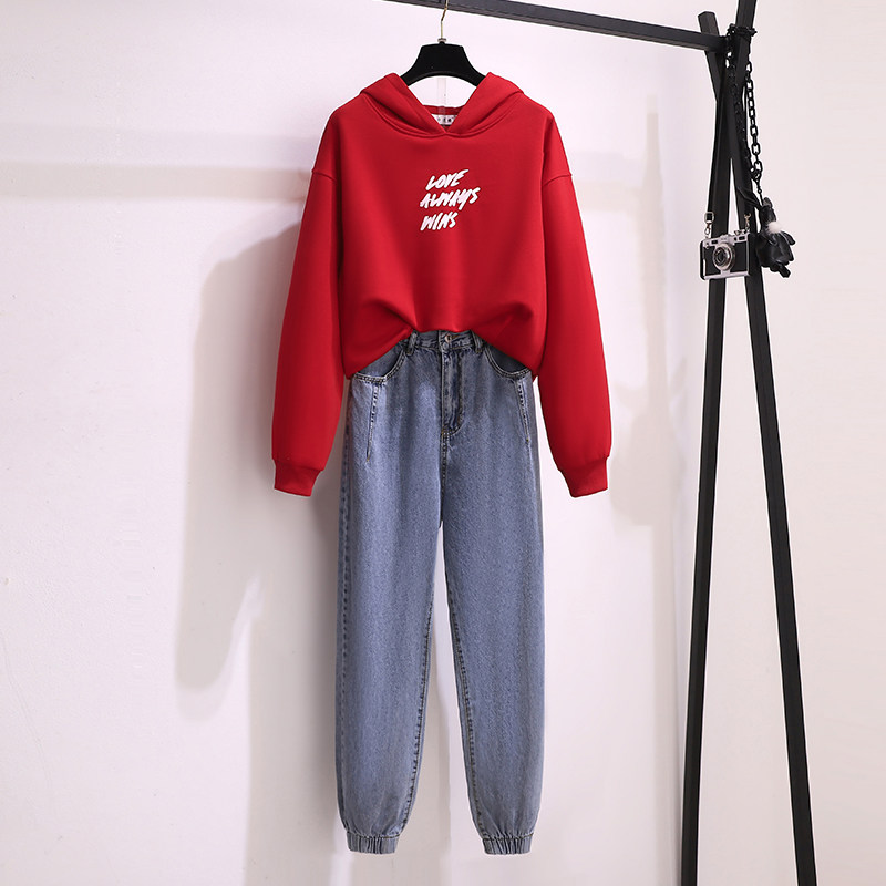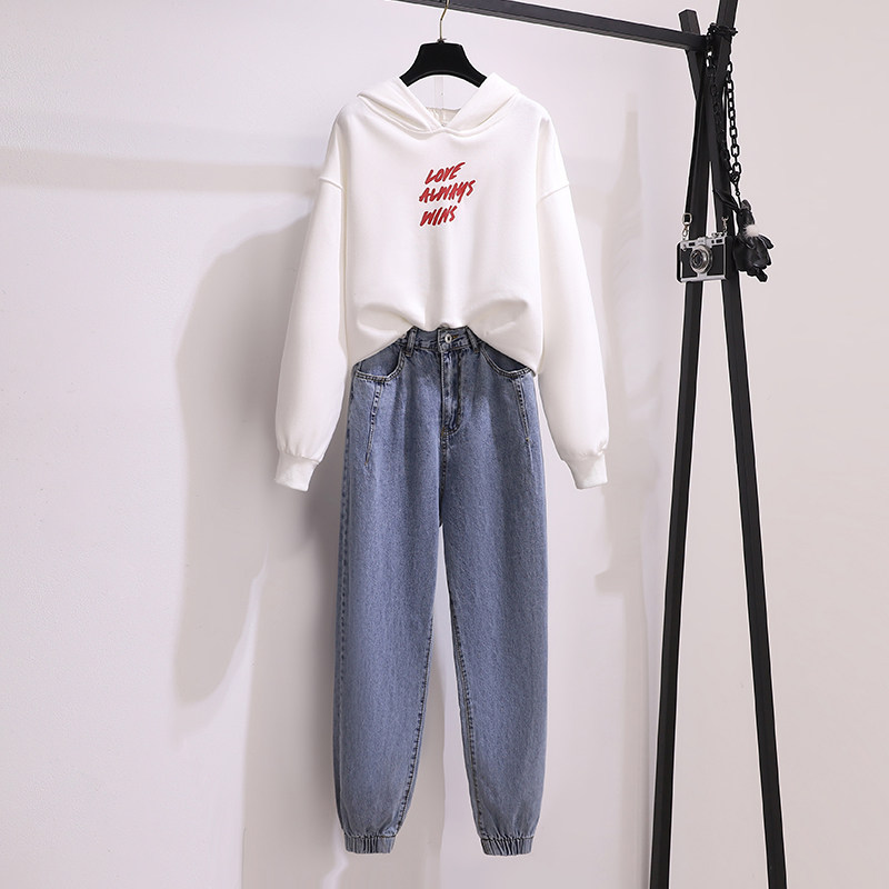 In the spring of 2022, the slightly fat sister's letter printing senior feeling sweater covered his hips and separated from the nine-point denim pants suit.