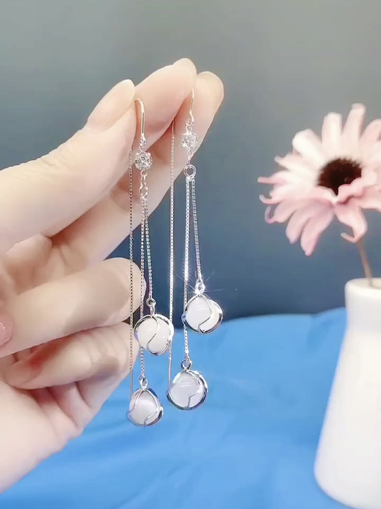 s925 pure silver streaming suearrings female long version of fine cat eye stone earrings super-fairy-ear necklace fashion temperament 100 hitch