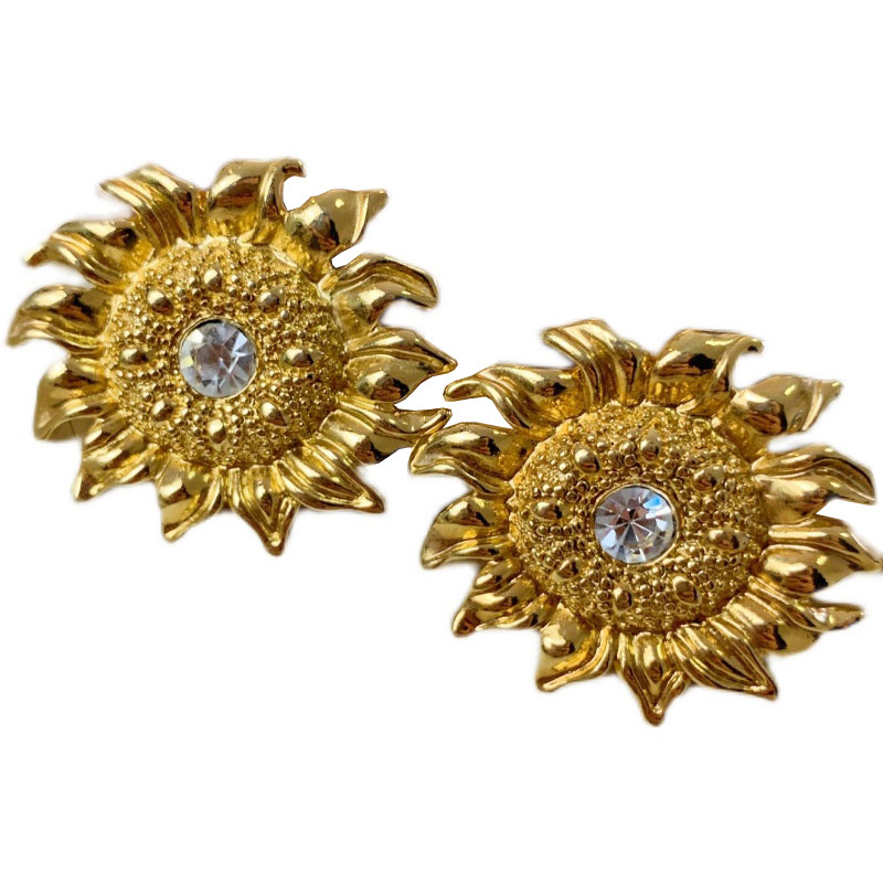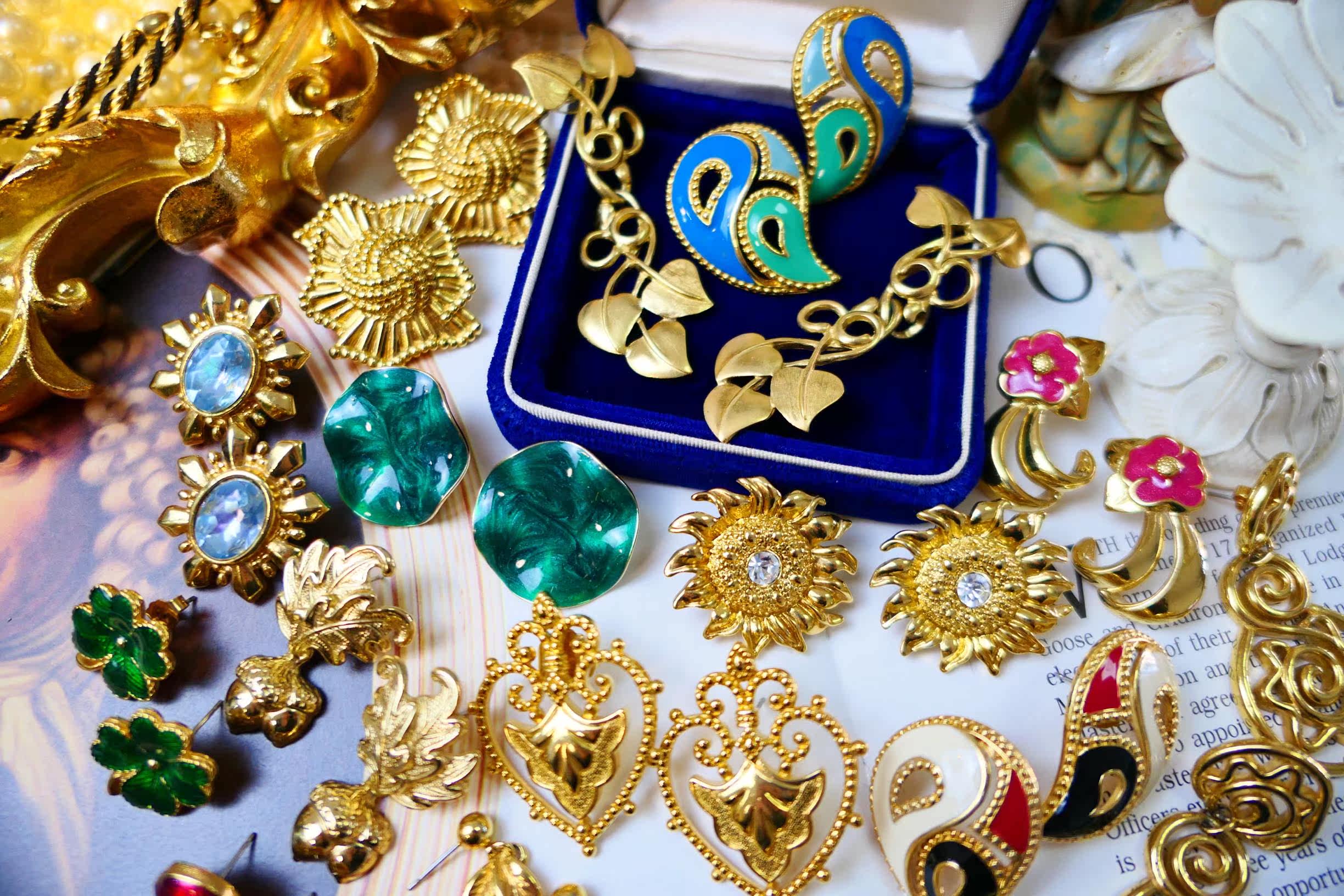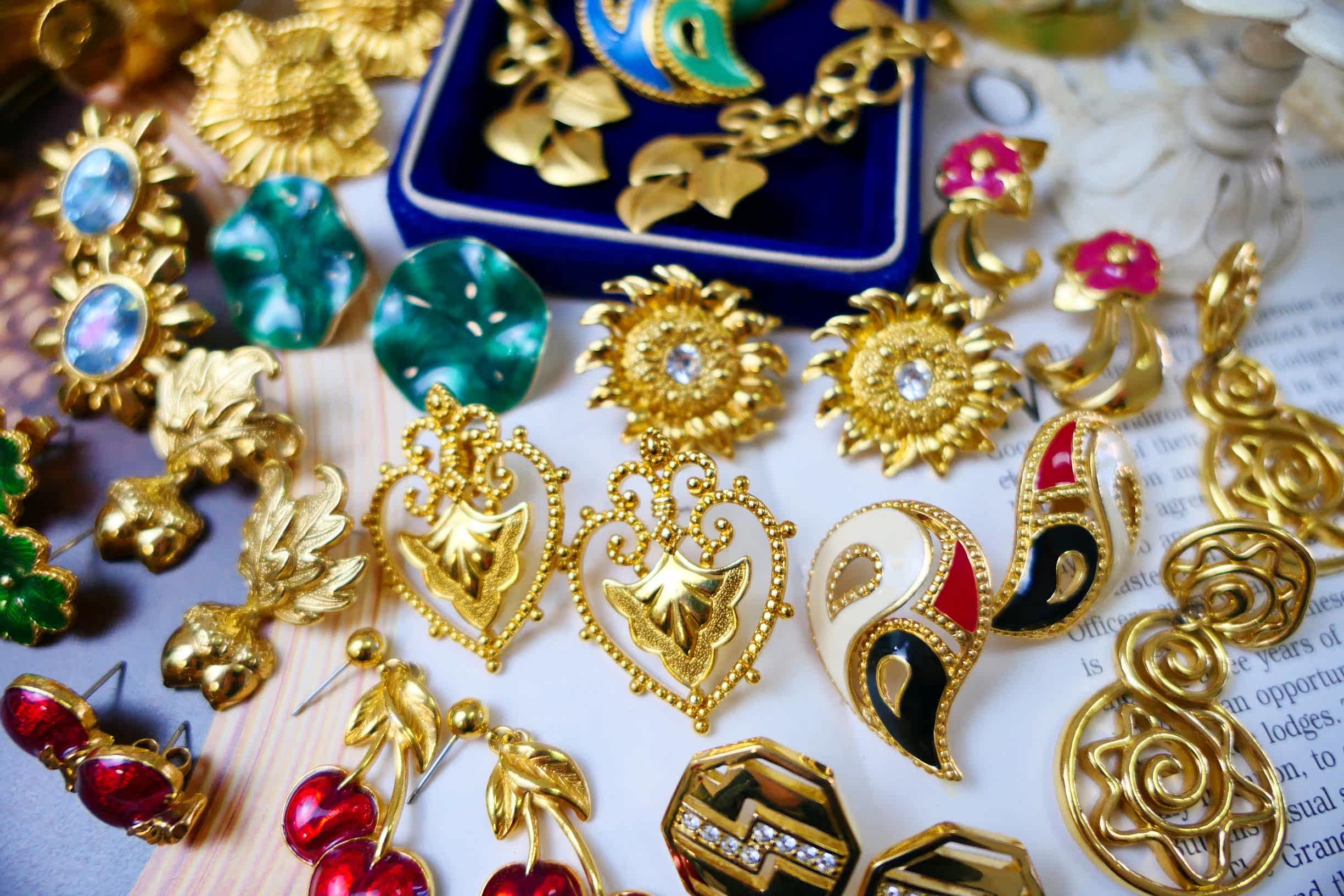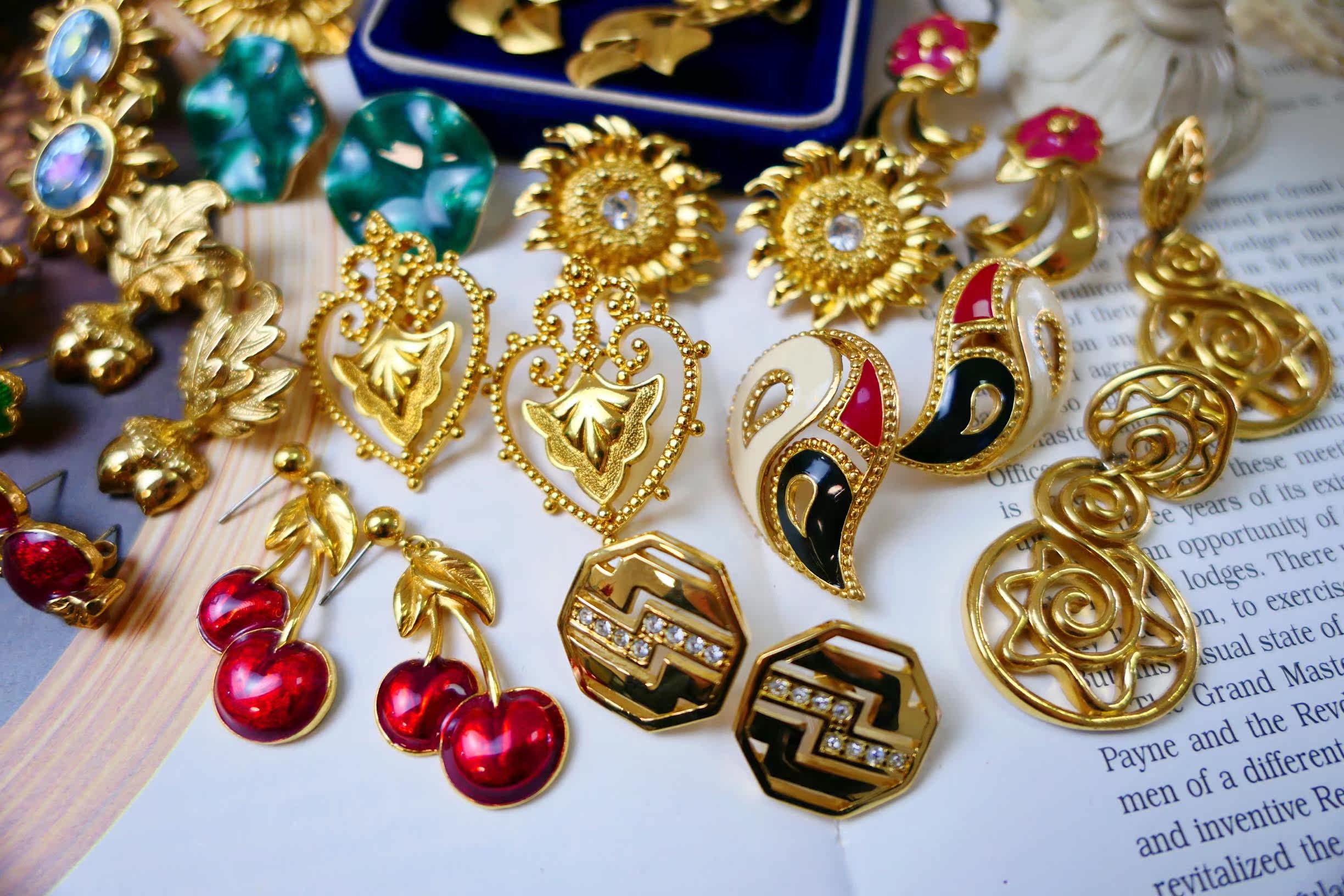 Milky white white tuxedo gold orange red rose red emerald green fluorescent green sky blue peacock blue sapphire blue (VINTAGE sold not returned or exchanged) A-Gold-plated twisted flower hollow ear pin B-Navy