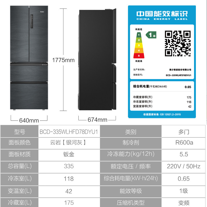 Haier Refrigerator 335L French multi-door household with first-level energy efficiency air cooling without frost 335WLHFD78DYU1