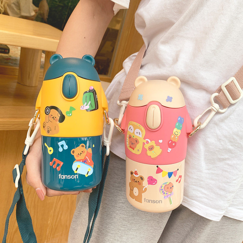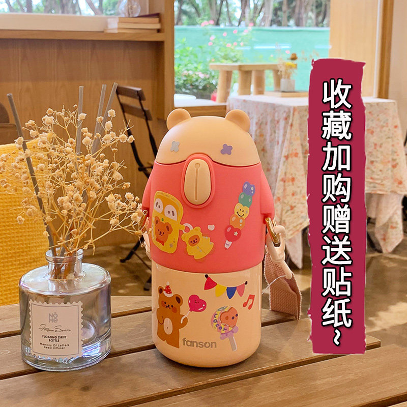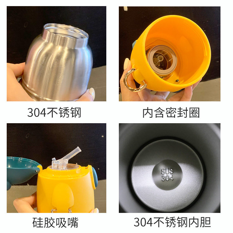 Children's thermos cup with suction tube baby kindergarten cute Primary School students portable straight drinking cup stainless steel kettle