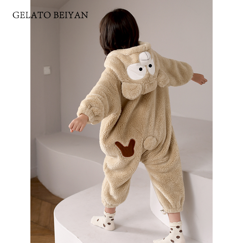 Beyan children pyjamas winter coral suede thickened with suede warm and cap cute bear even body can be worn outside the home clothes