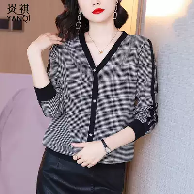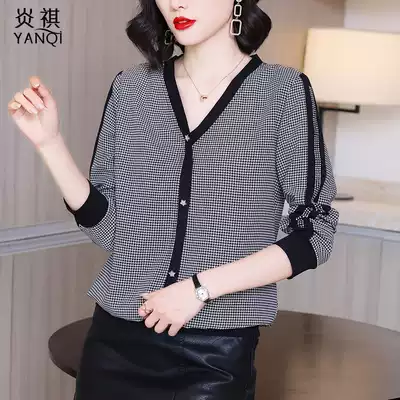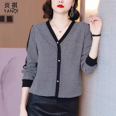 2021 early autumn new loose Korean version of houndstooth long-sleeved chiffon shirt women's fashion one-on-one V-neck small shirt tide