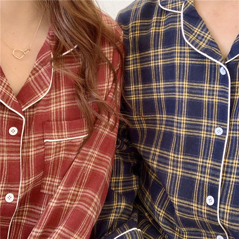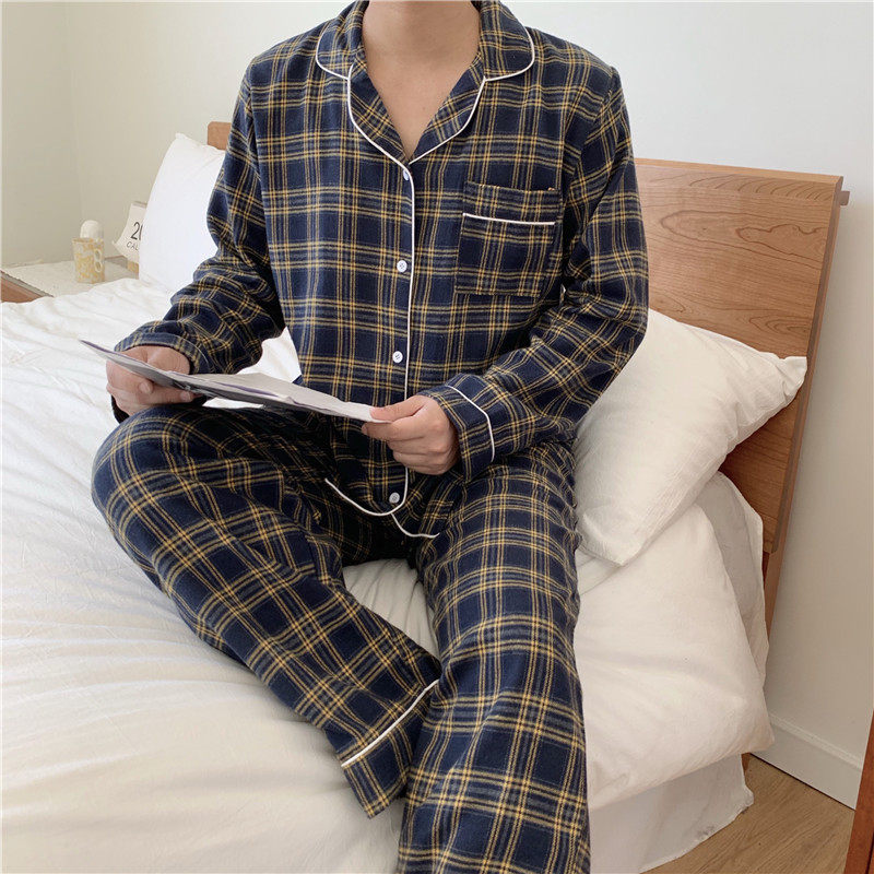 Couples pajamas plaid brushed cotton suit men and women spring and autumn long-sleeved leisure and comfortable two-piece home clothes