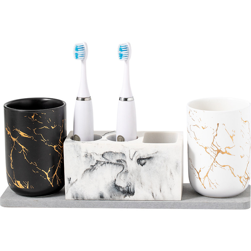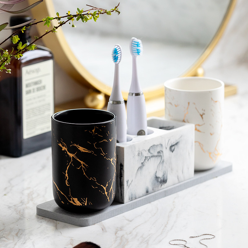 Marble Veins Toothbrush Holder White Marble Textured Ceramic Gargling Cups Black Marble Textured Ceramic Gargling Cups Four Pieces of Silicone Algae Clay