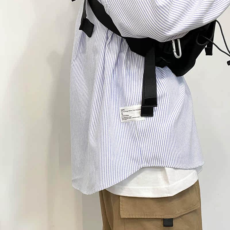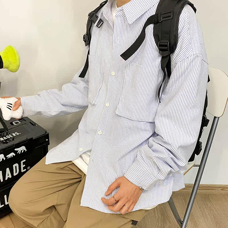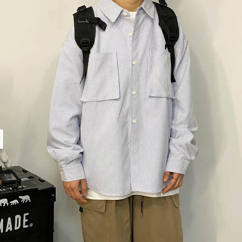 2021 Spring Days Department Retro Salt Department Cubism Solid Pocket Tooling Loose Light Blue Striped Shirt Male long sleeves Nets