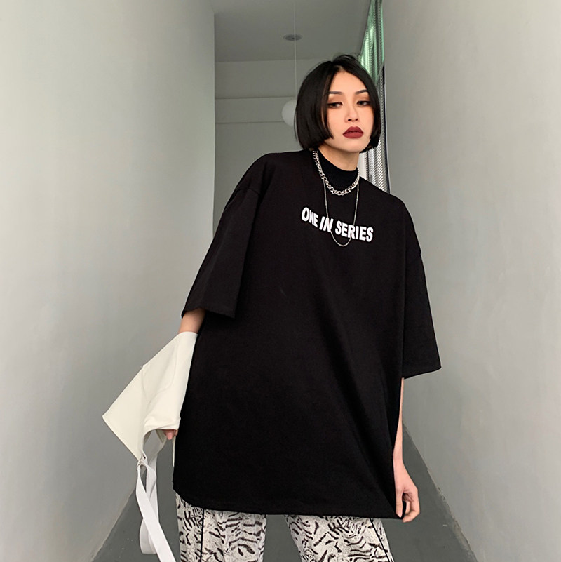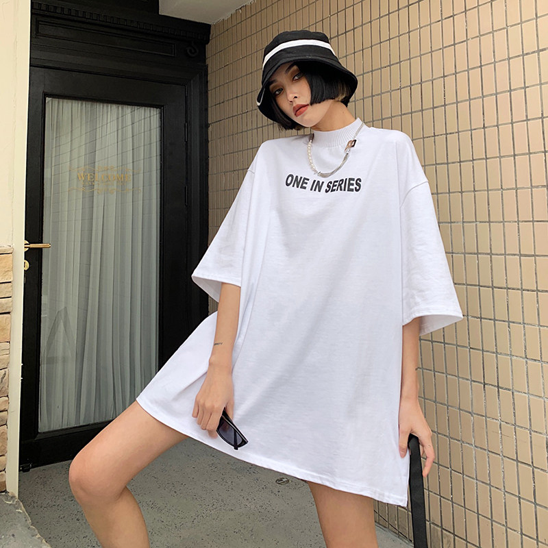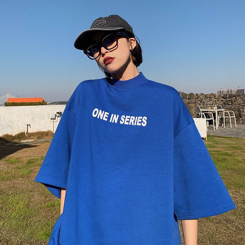 How to get foam red short sleeve t-shirt female summer loose with white tide card ins and half sleeves high-collar hip-hop blouse
