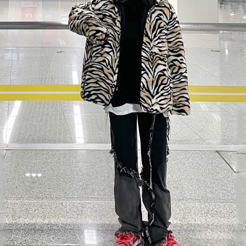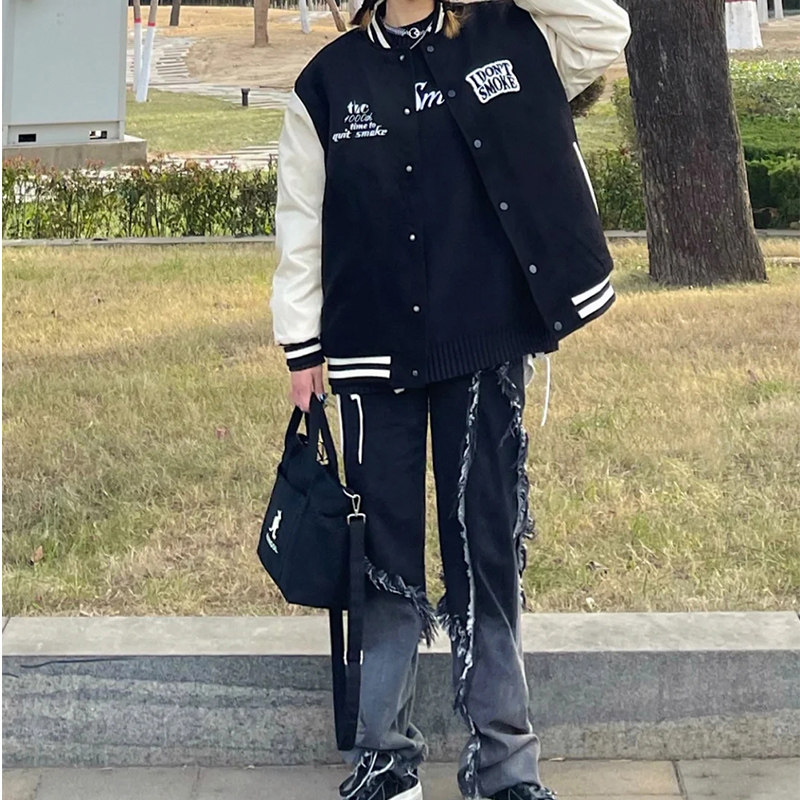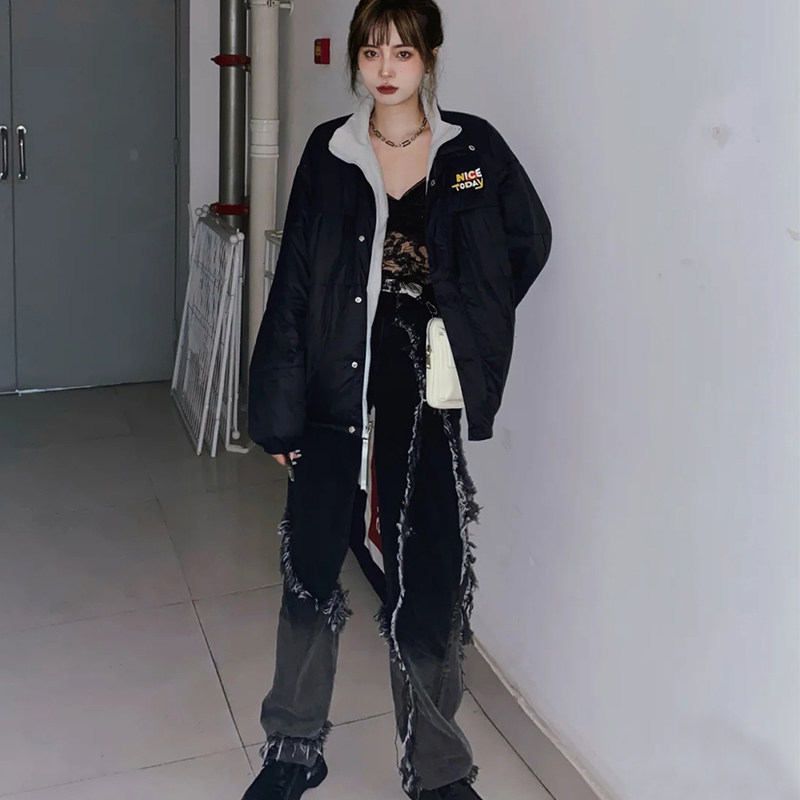 Retro gradient black gray raw edge washed jeans for men and women spring and summer loose straight high waist daddy pants trendy ins