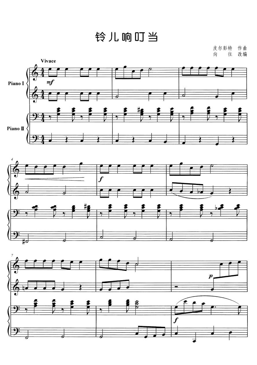 Children's Song Christmas Song Jingle Bells Four Hands Piano Score - 3 pages