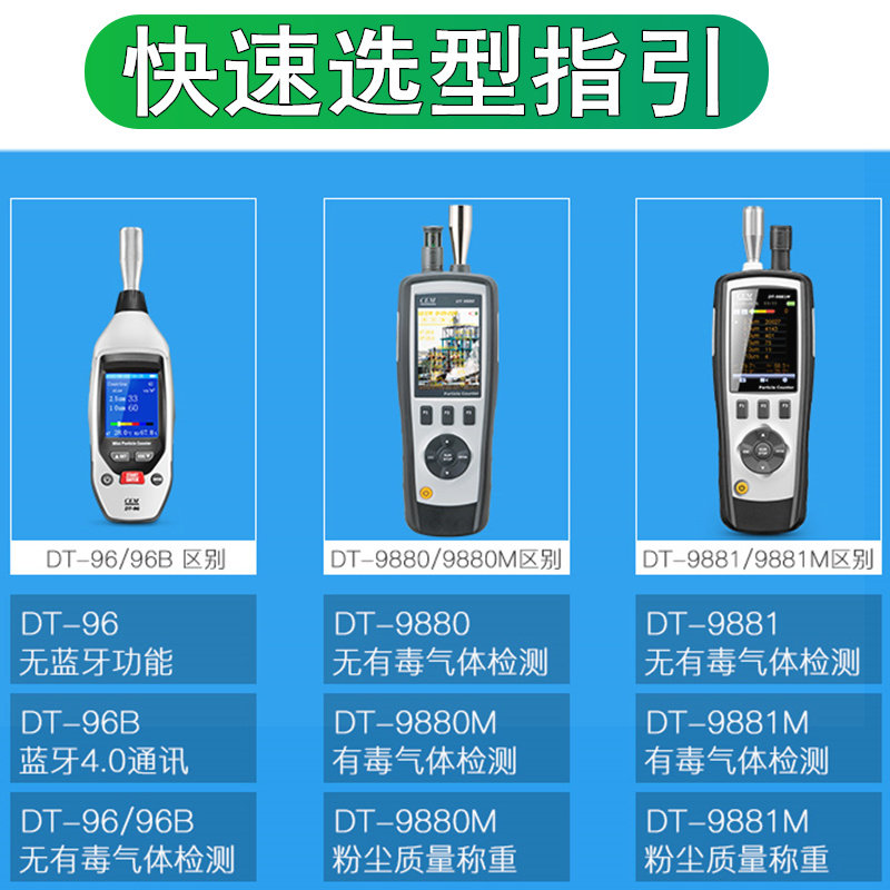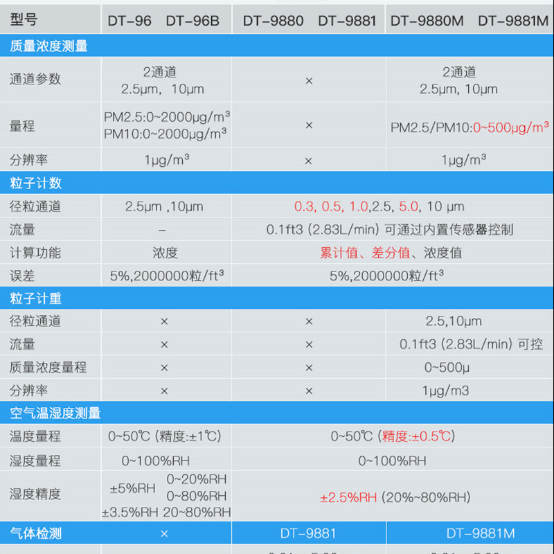 DT-96 Dual-channel PM2 5 10 DT-96B Mobile Bluetooth version Dual-channel PM2 5 10 DT-9850M Three-channel PM0 3
