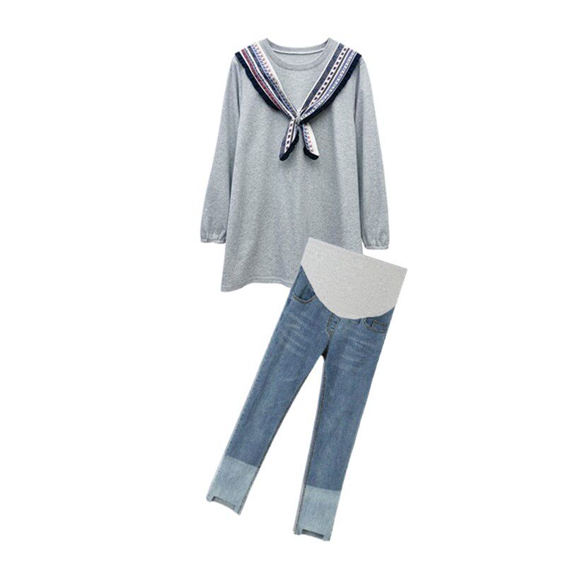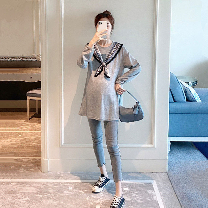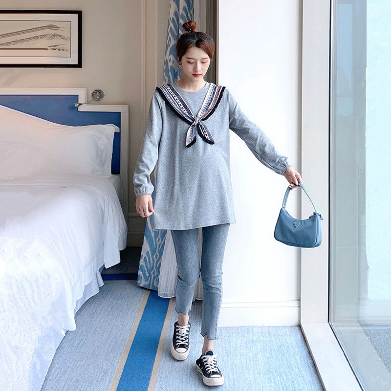 Pregnant Woman Autumn Winter Dress Plus Suede Suit 2021 New Stylish Navy Collar Personality Pregnant Woman Blouse Belly Jeans
