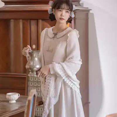 Chuandai:Lily of the Valley painter doll collar color matching fake two-piece dress Forest embroidered bubble sleeve skirt