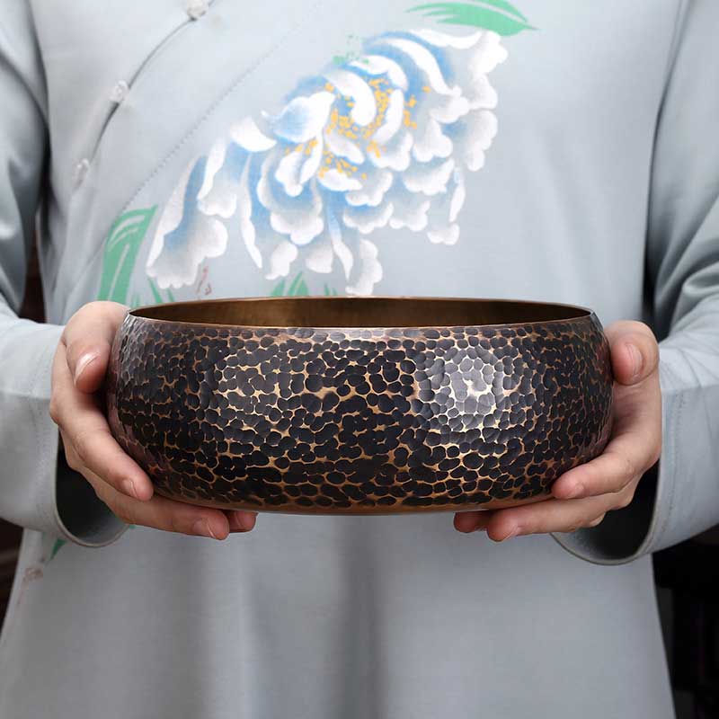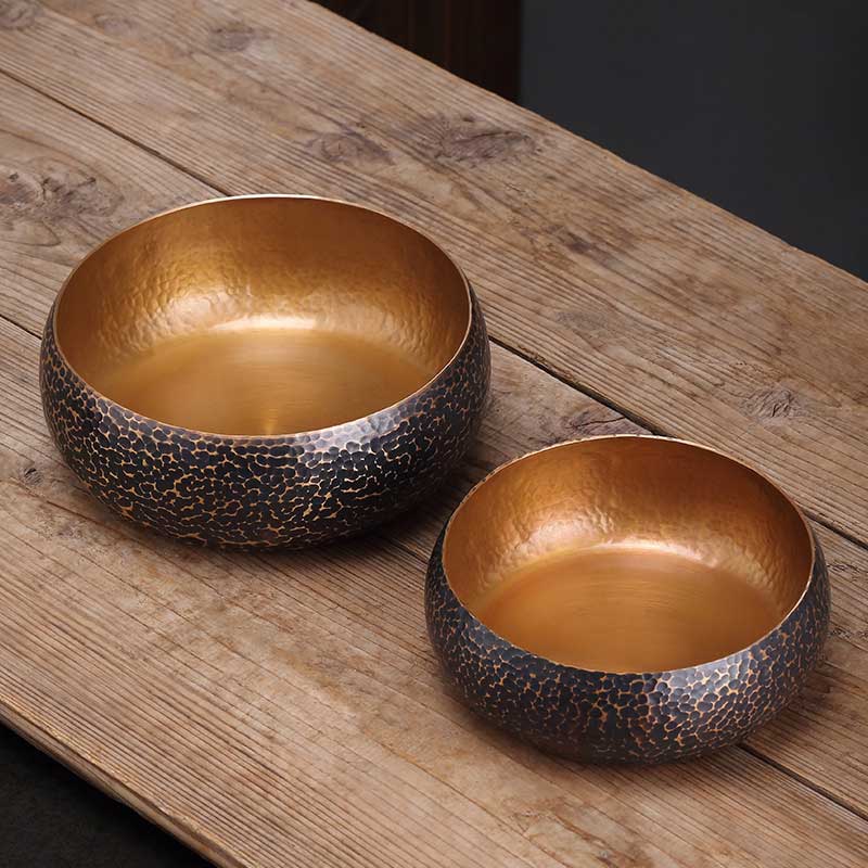 Small gilt bronze tea wash Large Gilt bronze tea wash Small copper hammer pattern tea wash Large copper hammer pattern tea wash