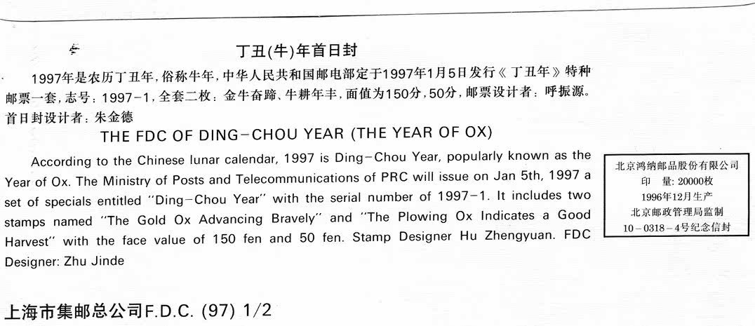 1997-1 Din Ugly Bull year Special Stamps First Day of the Year