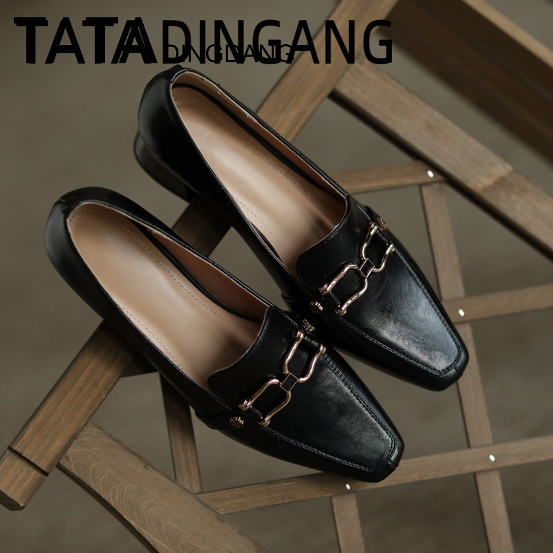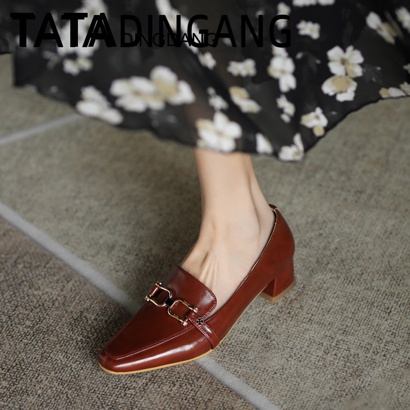 TATA DINGDANG he she jingle women's shoes medium heel square toe shoes thick heel soft sole work shoes women's leather shoes