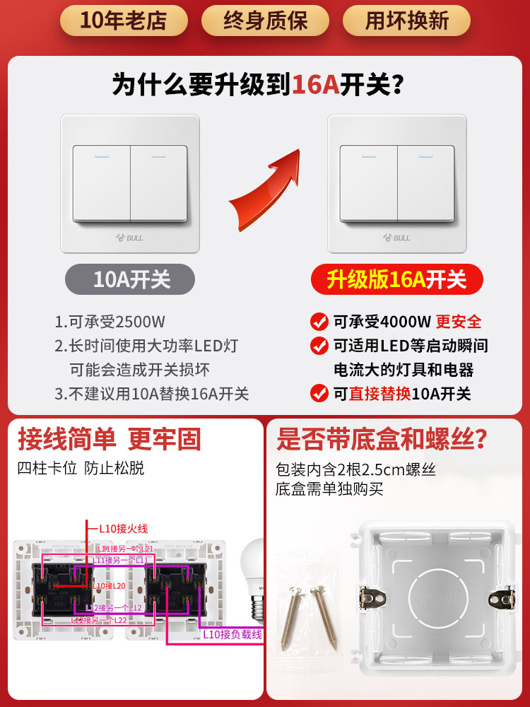 Bull double open switch two 2 position double control two position duplex home 86 type wall lighting power switch panel