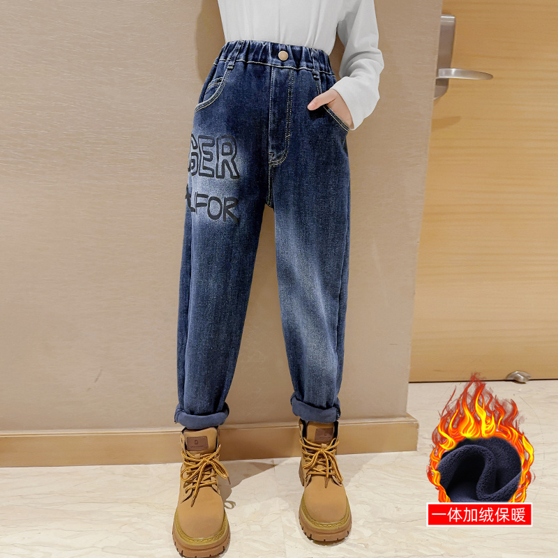 Girls' fleece jeans all-in-one fleece autumn and winter clothes 2022 new middle-aged children's thickened loose casual long pants