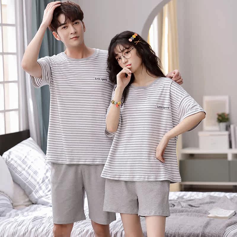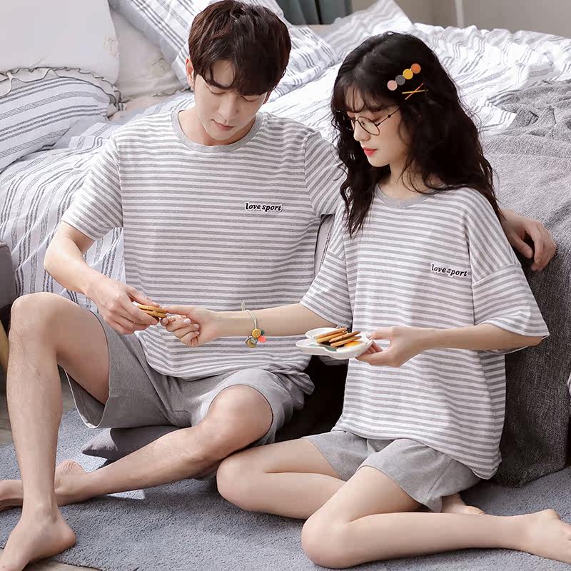 2 Sets Price Couples Pyjamas Summer Pure Cotton Short Sleeves Thin striped Casual Home Wear women Summer Grand sizes Sizes Suit Men