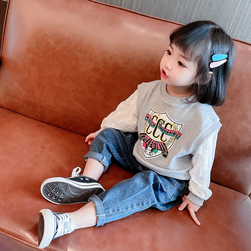 Girls' spring clothes cartoon stitching lace puff sleeves fake two-piece sweater female baby Western style casual Korean style inner wear
