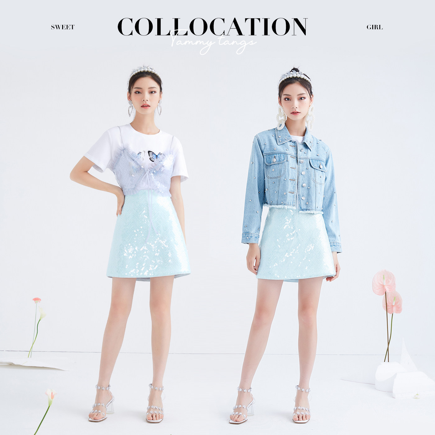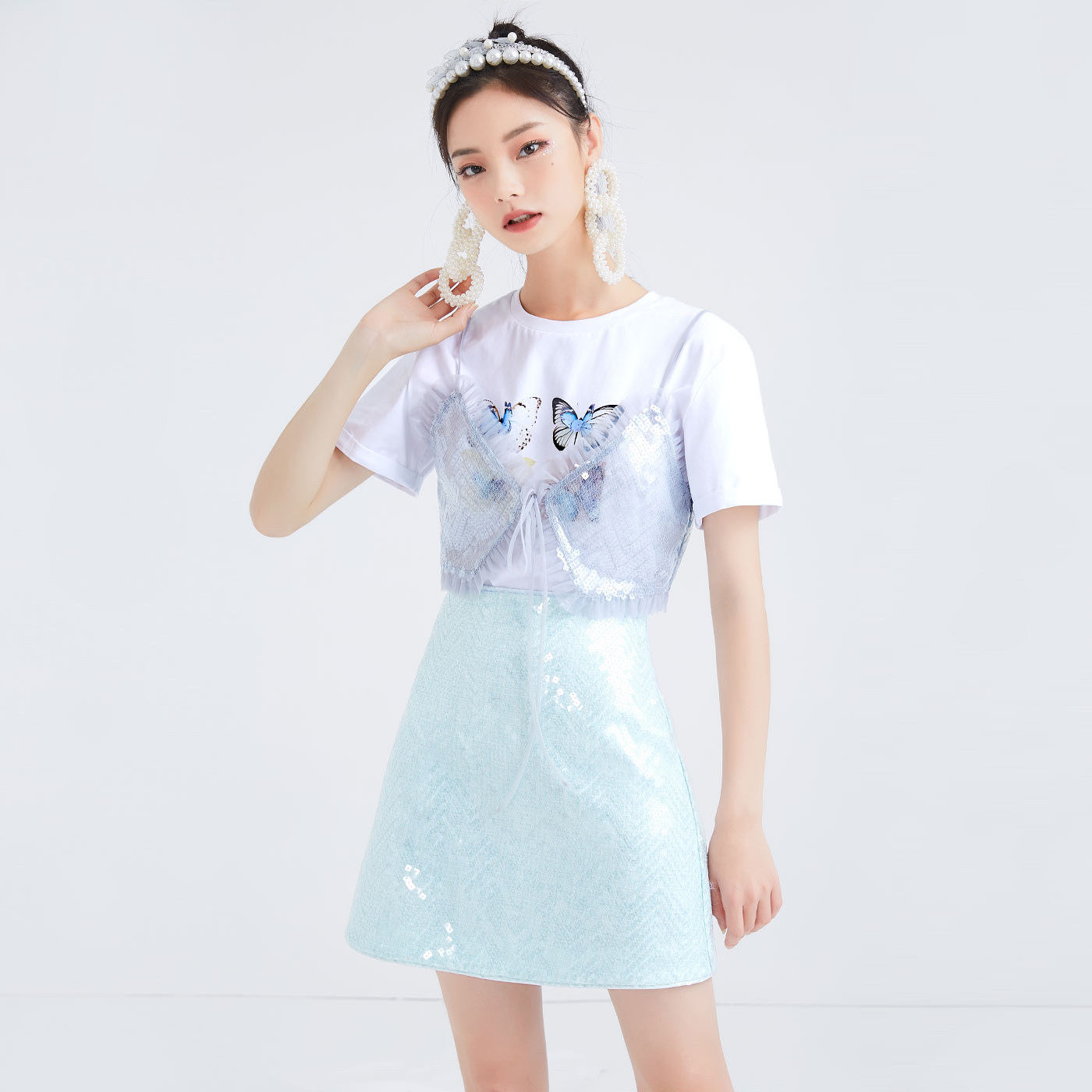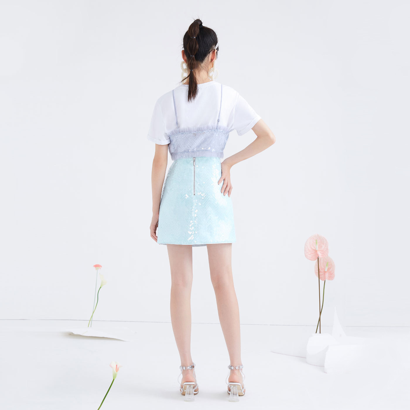 (Mall same section) Sugar spring new embroidered bead sheet splicing half body skirt woman high waist display slim A-character skirt short skirt