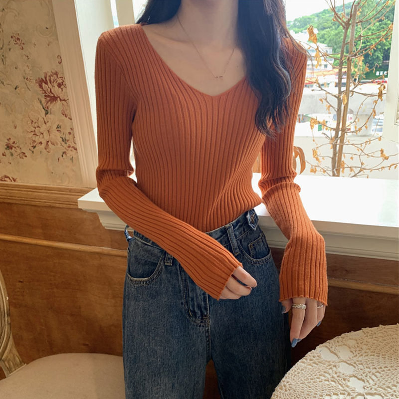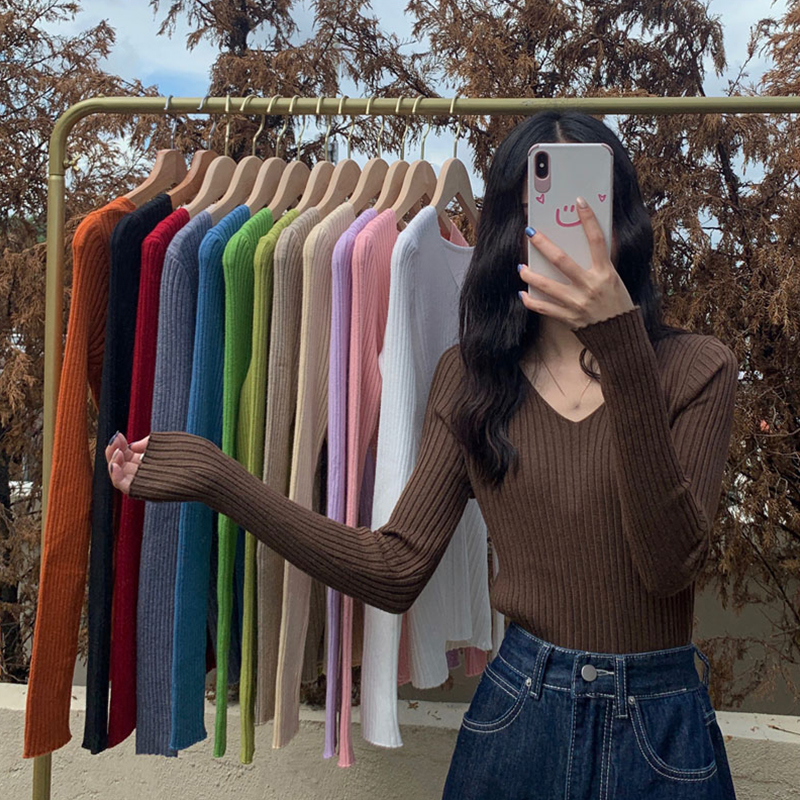 2021 Spring new display slim V collar Long sleeve blouse Women's Yoo 100 lap pit Bar knitwear Elegant Wind Black T-shirt