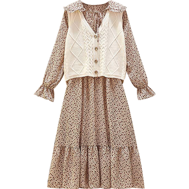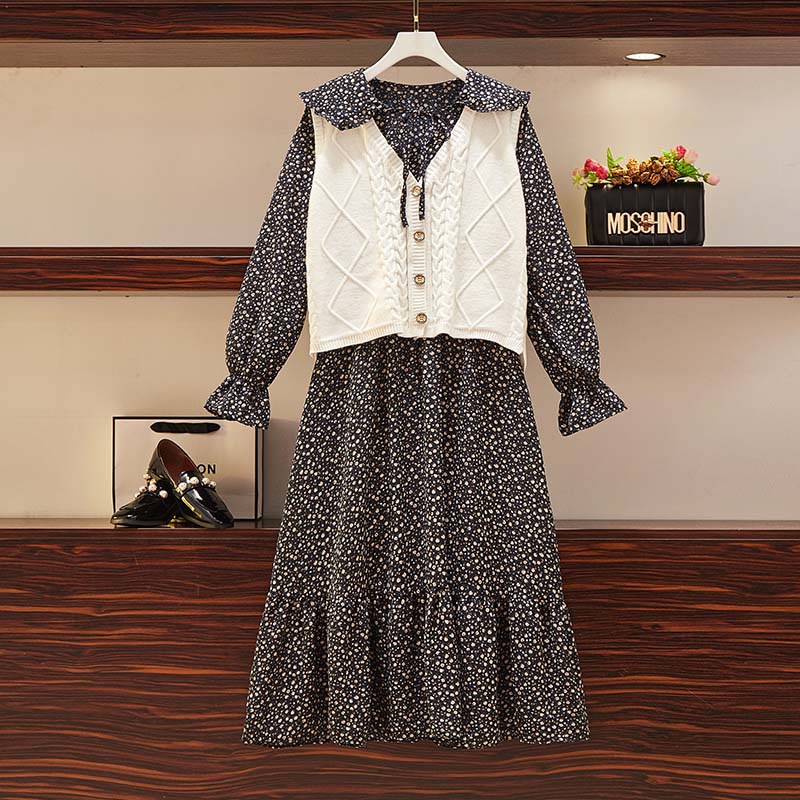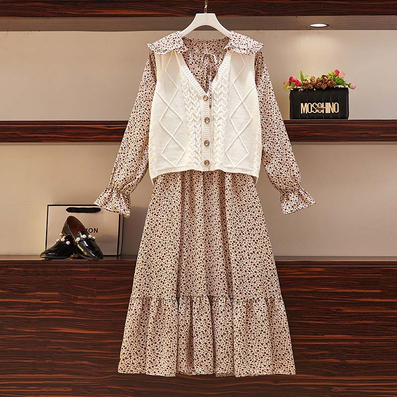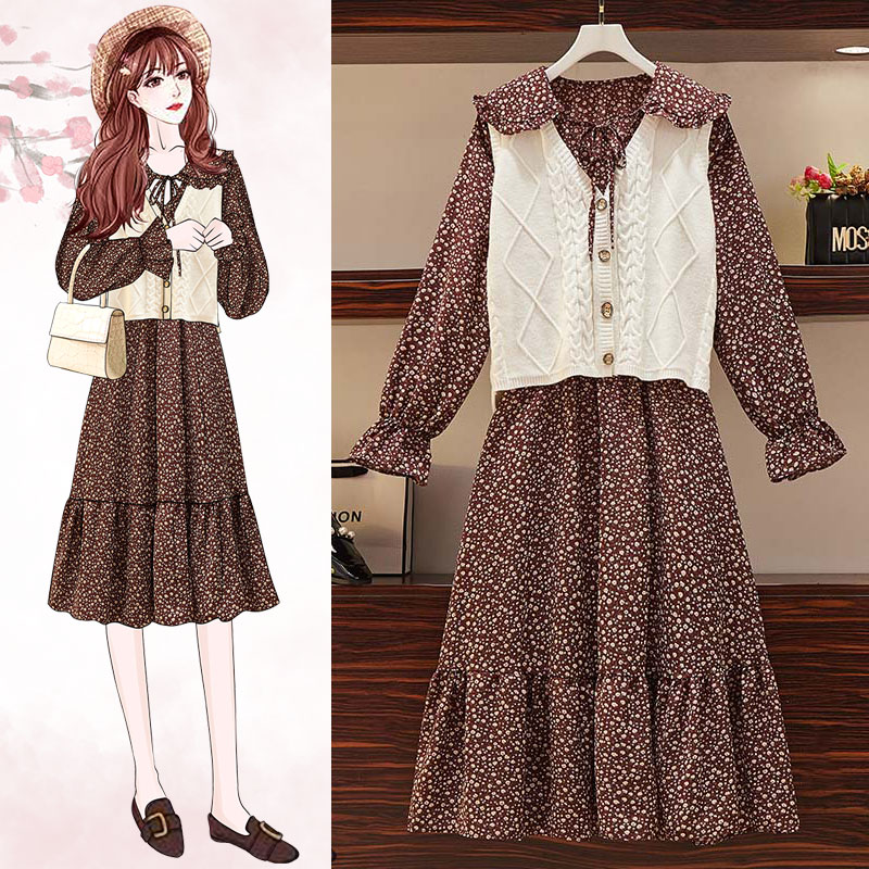 Knitted vest with doll collar floral skirt women's chiffon set dress zi 2022 early fall new dress