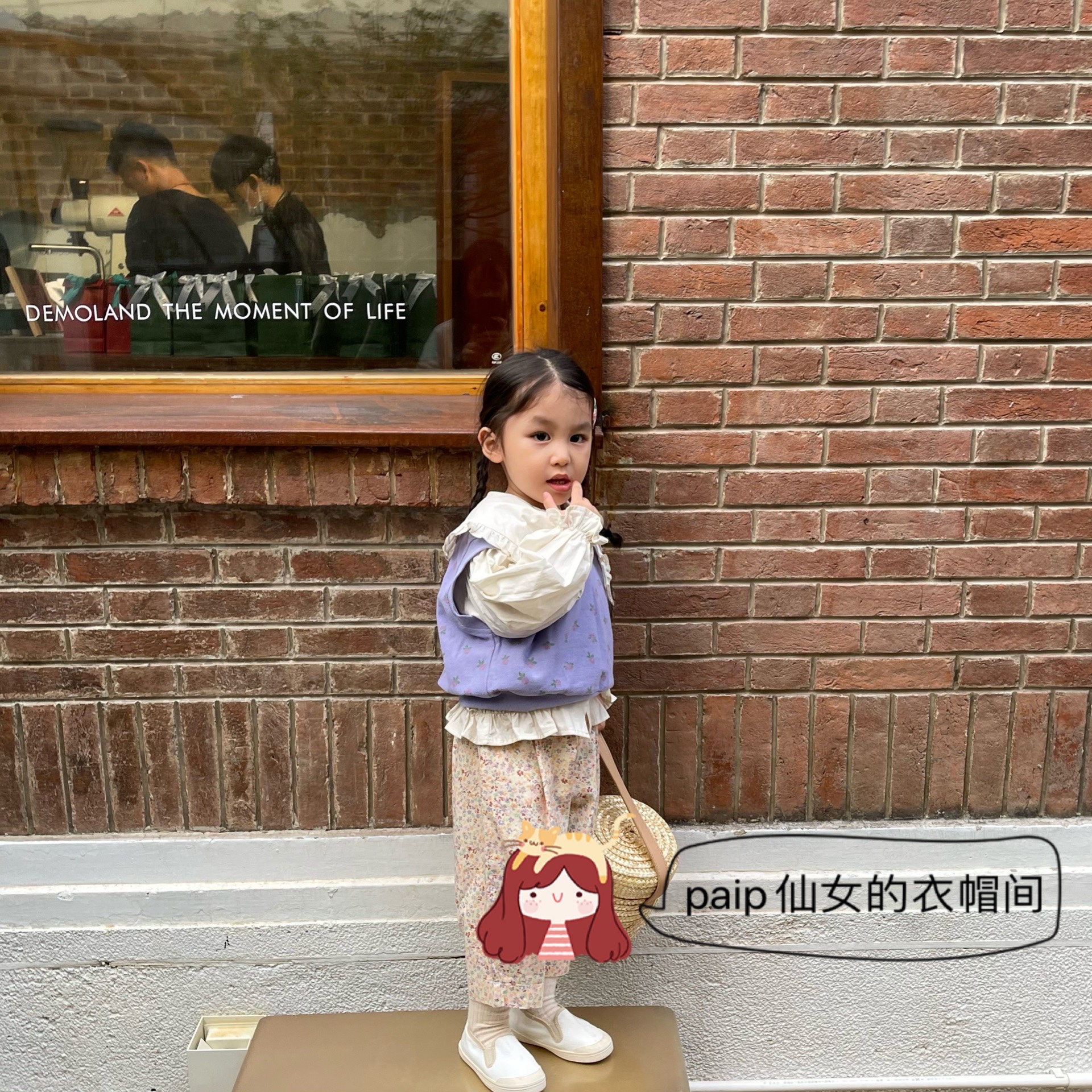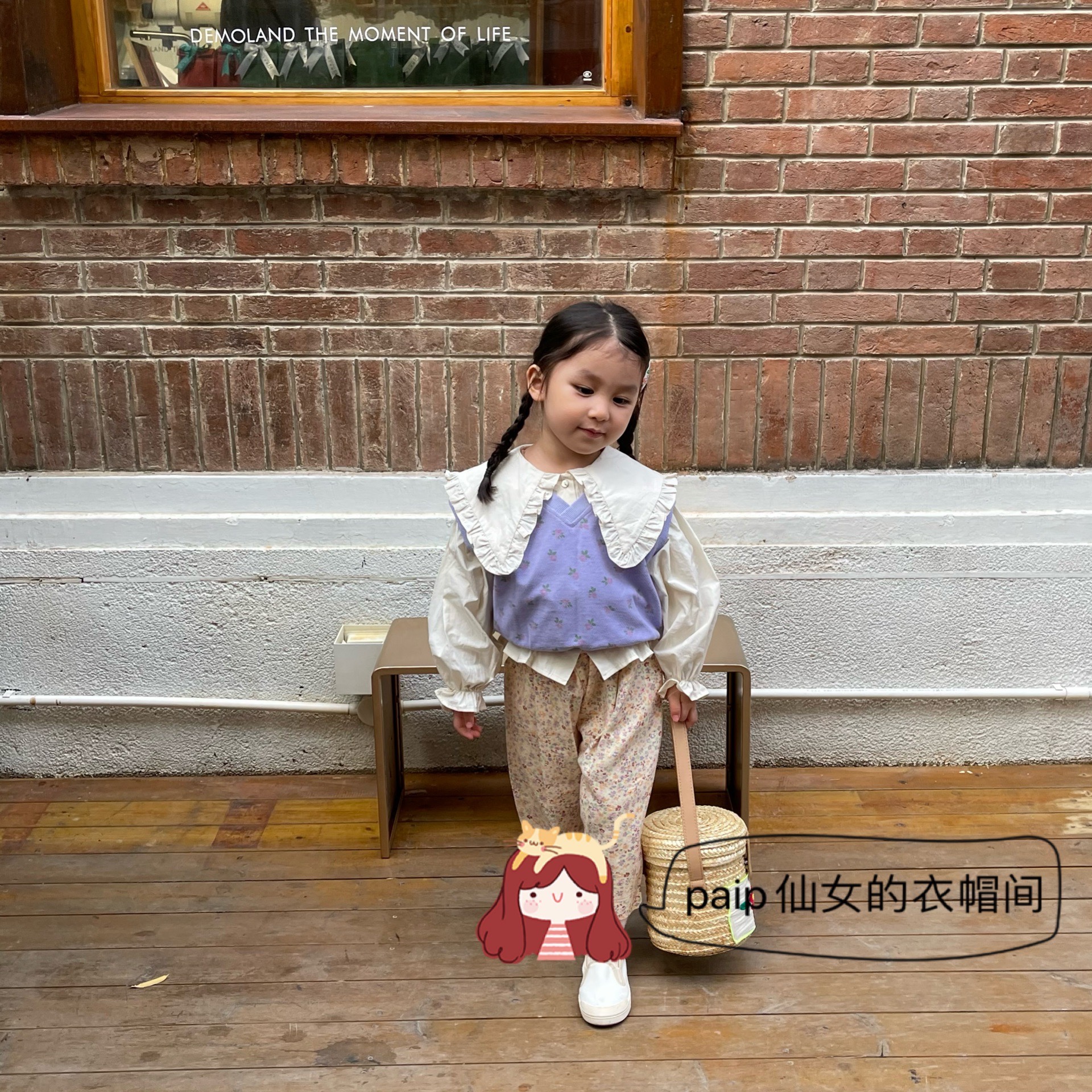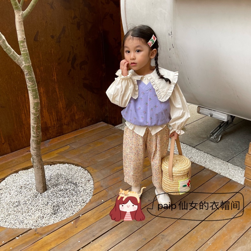 2021 children's wear floral denim wide pants lapel lace shirt vest set girls ins style Korea paip