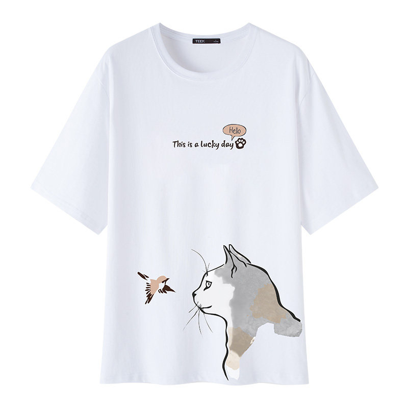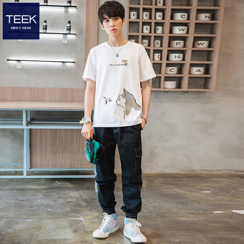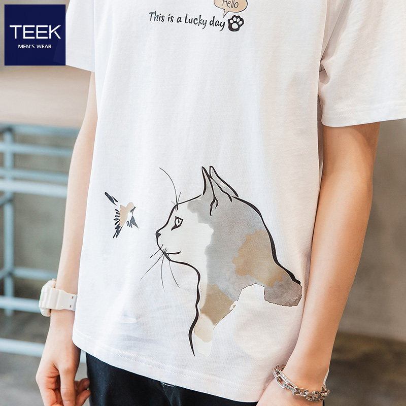 TEEK pure cotton short sleeve men's t-shirt teen student kitty printed half sleeve 2022 summer new wave card clothes