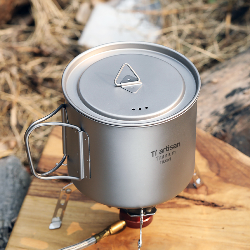 Titanium Artisan Wild Camp Hanging Pan Pure Titanium Pan With 1 1L Picnic Cooker Single Bubble Noodle Pan Burn Soup Pan Portable Light Weight Pan
