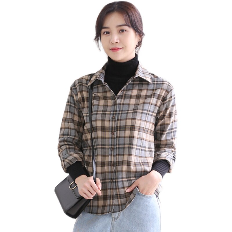Grinders Plaid Shirt Woman Autumn Winter New Ins Fashion Foreign Pie Long Sleeve Loose Design Sense Little pure cotton shirt